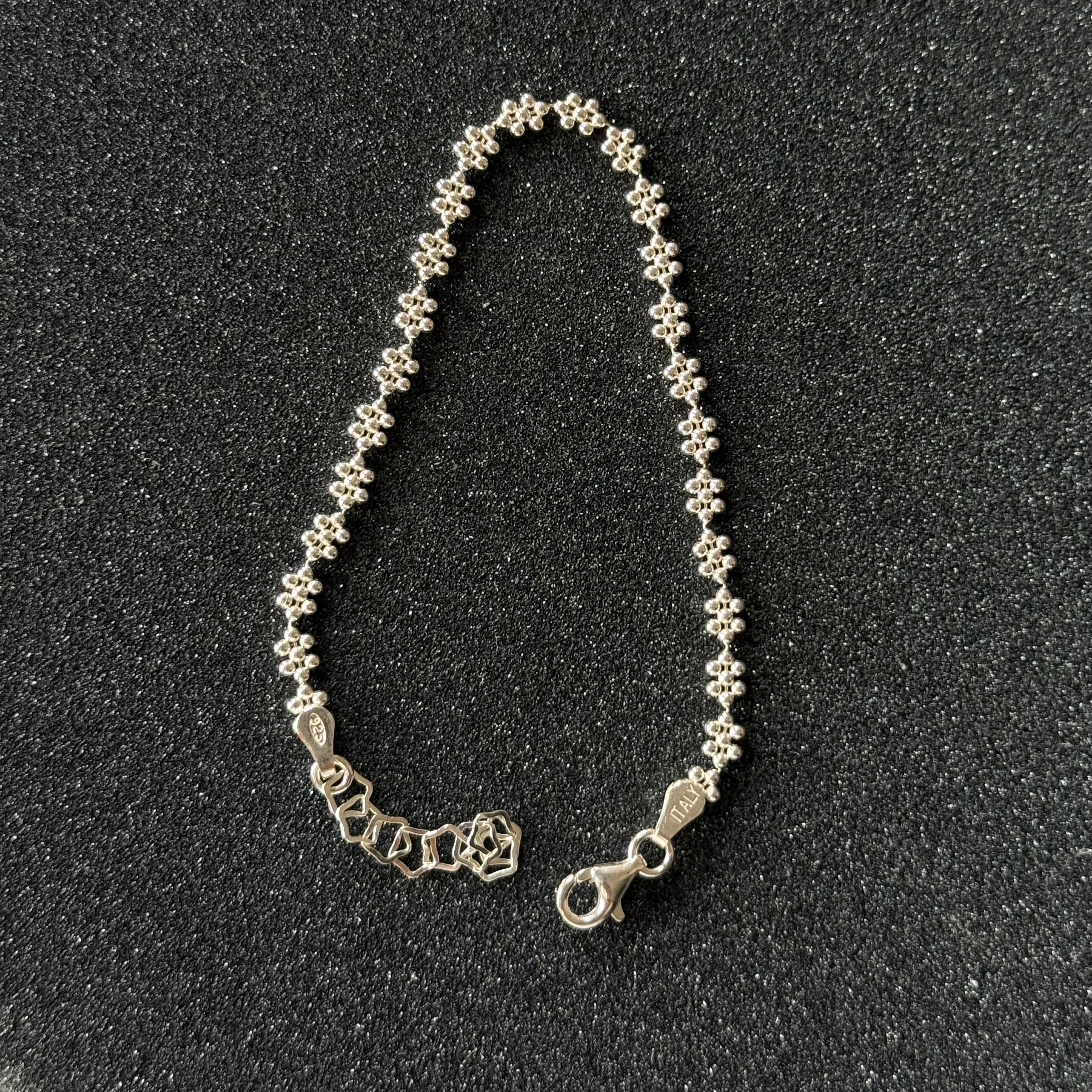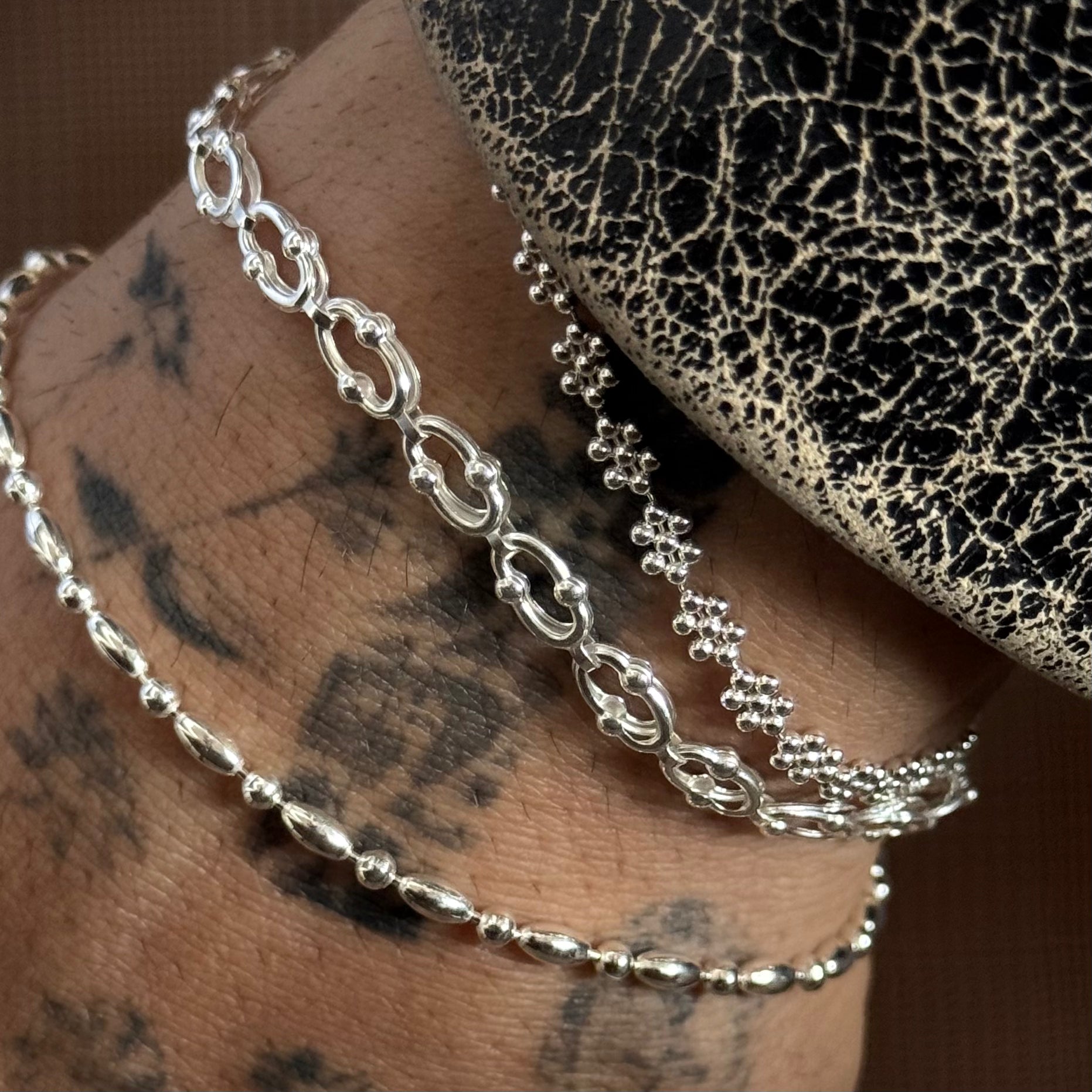 Oltâ bileklik, 925 ayar gümüşten ve el işçiliğiyle üretilir. Her parça, ustalarımızın titiz çalışmasıyla hayata geçirilir; gümüşün doğal dayanıklılığı formunu korurken, özenli kullanımla ışıltısını uzun süre kaybetmez. Ciltle dost yapısıyla öne çıkan gümüş, diğer materyallerin aksine vücutta iz bırakmaz ve alerjiye neden olmaz.