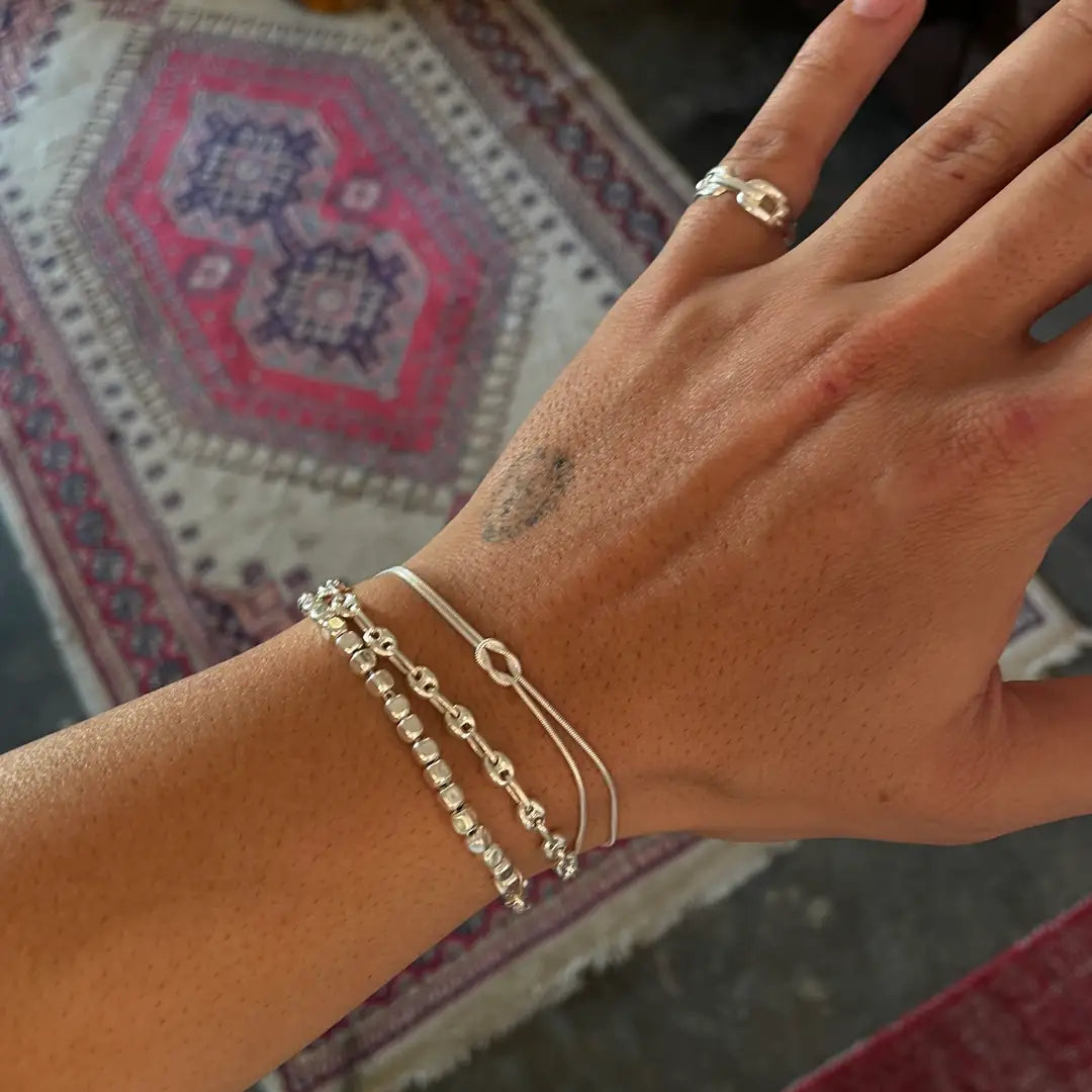 Oltâ bileklik, 925 ayar gümüşten ve el işçiliğiyle üretilir. Her parça, ustalarımızın titiz çalışmasıyla hayata geçirilir; gümüşün doğal dayanıklılığı formunu korurken, özenli kullanımla ışıltısını uzun süre kaybetmez. Ciltle dost yapısıyla öne çıkan gümüş, diğer materyallerin aksine vücutta iz bırakmaz ve alerjiye neden olmaz.